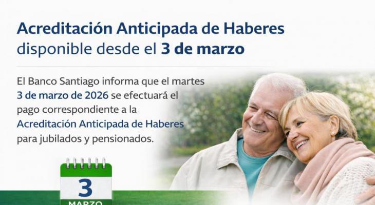 El Banco Santiago del Estero comunica que el dia Martes 3 de Marzo de 2026 se encontrará disponible la Acreditación Anticipada de Haberes destinada a jubilados y pensionados que operan con la Entidad.