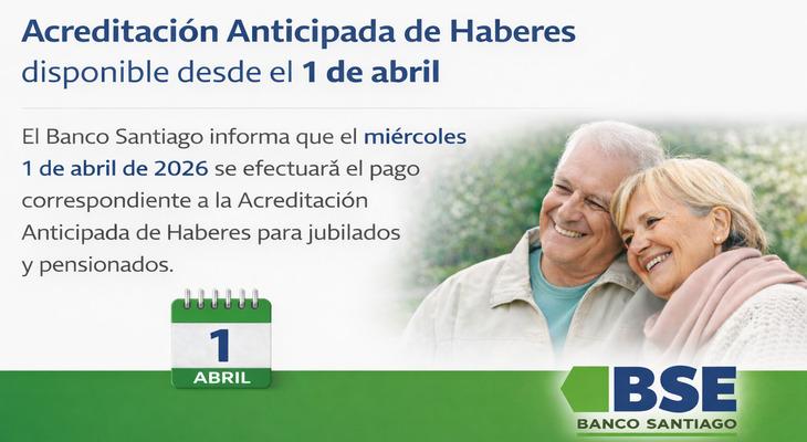 El Banco Santiago del Estero comunica que el dia Miercoles 1 de Abril de 2026 se encontrará disponible la Acreditación Anticipada de Haberes destinada a jubilados y pensionados que operan con la Entidad.