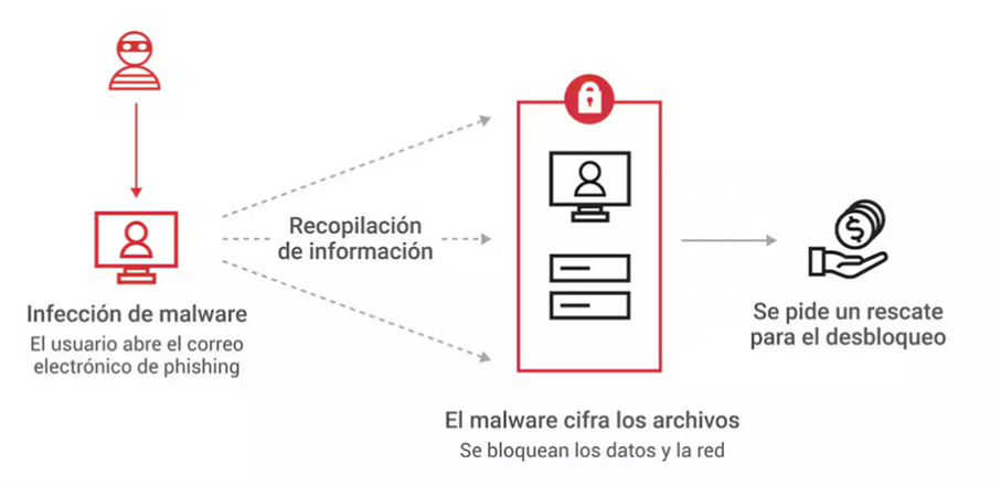El ransomware es malware que cifra archivos importantes en almacenamiento local y en red y pide un rescate para descifrarlos. Los hackers desarrollan este malware para ganar dinero mediante la extorsión digital. El ransomware está cifrado, por lo que no es posible forzar la clave y la única manera de recuperar la información es mediante una copia de seguridad. La forma en la que funciona el ransomware lo convierte en un sistema especialmente perjudicial. Otros tipos de malware destruyen o roban datos, pero ofrecen la posibilidad de otras opciones de recuperación. Mediante el ransomware, si no existen copias de seguridad, debe pagar el rescate para recuperar los datos. Algunas empresas pagan el rescate y los atacantes no envían la clave de descifrado. Una vez que el ransomware empieza a funcionar, analiza el almacenamiento local y en la red en busca de archivos para cifrar. Se dirige a archivos que cree que son importantes para su empresa o para personas. Esto incluye archivos de respaldo que pudieran ayudar a recuperar la información. Hay distintos tipos de ransomware que atacan diferentes conjuntos de archivos, pero que también son objetivos frecuentes. La mayoría de ransomware ataca archivos de Microsoft Office porque, con frecuencia, almacenan información empresarial crítica. Al atacar archivos importantes aumentan las probabilidades de que pague el rescate.